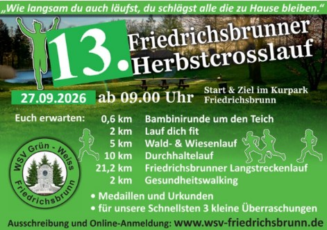 Der Friedrichsbrunner Herbstcrosslauf ist ein anspruchsvoller Geländelauf, also soll – bei allem sportlichen Ehrgeiz – der Spaß am Laufen in der Natur im Vordergrund stehen. Auf allen Streckenabschnitten bitten wir euch, möglichst rechts zu laufen, um ein sicheres Überholen zu ermöglichen. Natürlich bitten wir Euch, immer der Fairness den Vorzug zu geben.